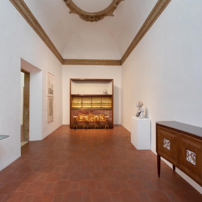 Di quest’ultimo, presente in mostra un nucleo di opere scultoree nate in occasione di questa amicizia, esempi apicali della tecnica ritrattistica dell’artista argentino e delle sue riletture dei temi equestri. Il percorso espositivo si conclude con la presentazione dei disegni originali di Fontana, realizzati nel 1956 per il progetto della facciata del Palazzo Tecno di Milano, voluto da Osvaldo Borsani, la cui esecuzione incornicia ancora oggi il primo piano dell’edificio della storica sede, e un cospicuo corpo di opere e di arredi coevi che permettono di ampliare lo sguardo su questo importante periodo di compenetrazioni e reciproche influenze delle arti italiane.